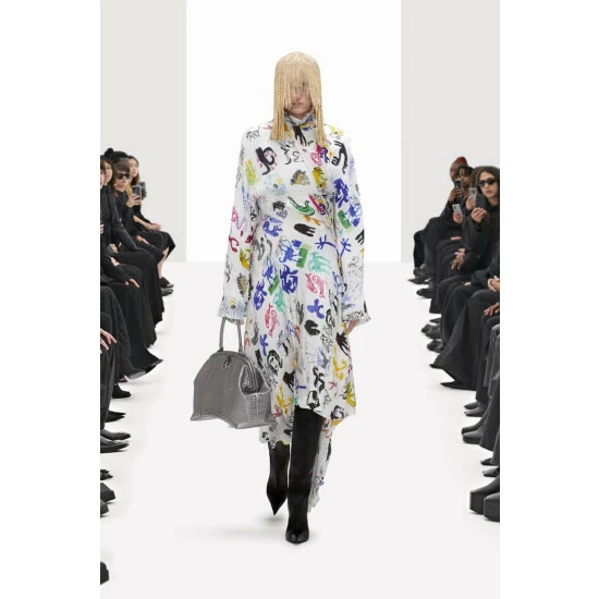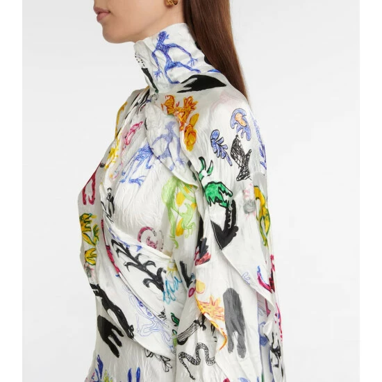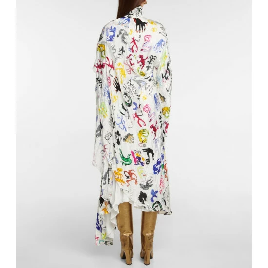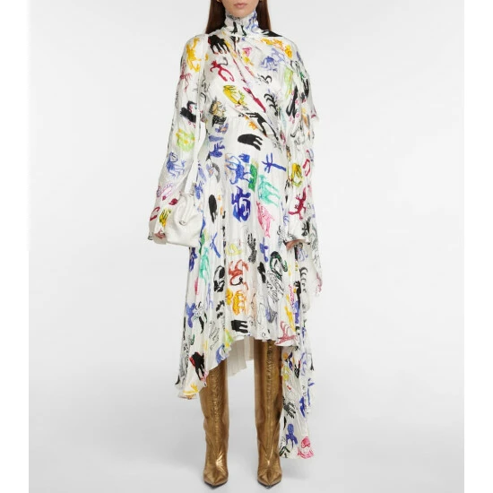 This printed dress is part of Balenciaga’s Twisted series: items which are assembled amiss to create an off-kilter effect. Made from satin, it combines a lengthy tie-neck with dolman sleeves and a doodle sketch print.