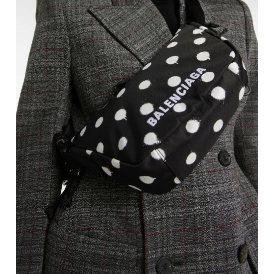 A modern accessory arsenal must include the Wheel shoulder bag from Balenciaga. This slouchy polka-dot design is made from nylon with a web strap and a utilitarian buckle, and finished with white logo embroidery