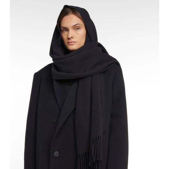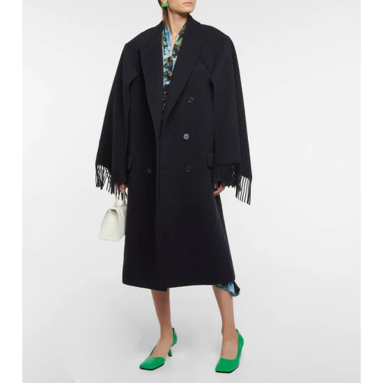 This Balenciaga blanket coat has a cowl-like hood and built-in, fringe-trimmed scarf. Made from a brushed virgin-wool blend, this long-line navy blue style promises warmth all winter long.