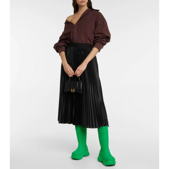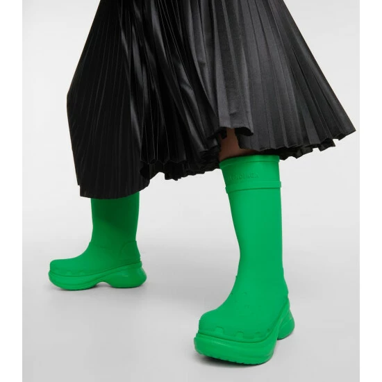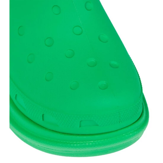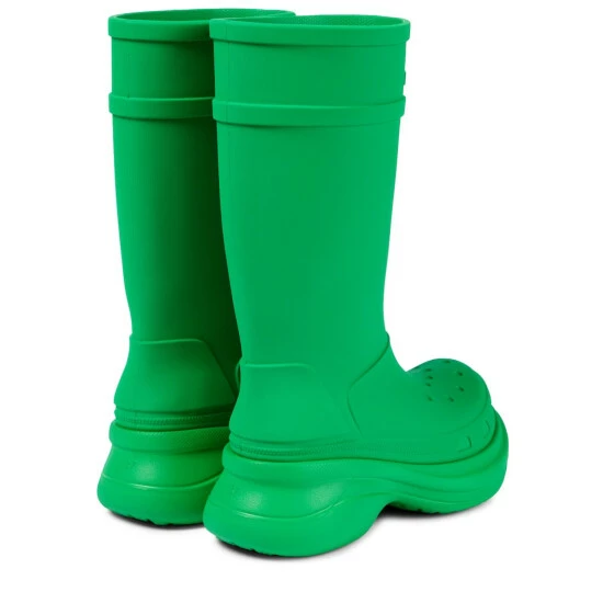 Crocs™ and Balenciaga collaborate on the contemporary design of the Crocs boots. They have indentations that mirror the classic clog silhouette and are entirely made of green rubber.