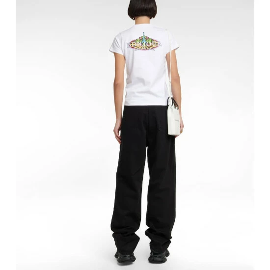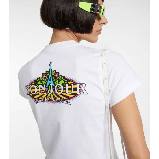 Practice your French with this chic T-shirt that features the Bonjour Balenciaga logo. Crafted in Portugal from organic cotton jersey in white, the crewneck style has a fitted silhouette with short sleeves. Tuck yours into to jeans and skirts alike.